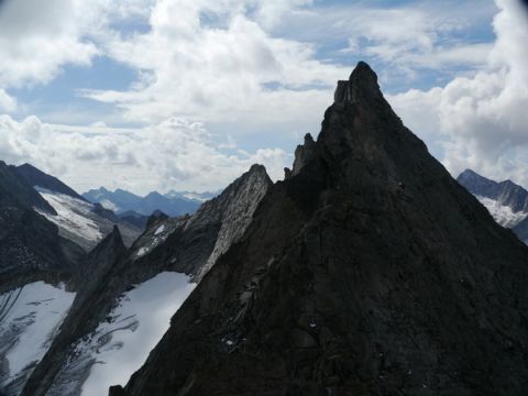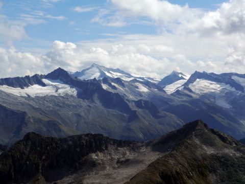 Dadurch haben wir die Möglichkeit, den Blick immer wieder nach links zu wenden, um einen Blick auf die eisbedeckten Gipfel der Venedigergruppe zu werfen, die sich hier imposant genau im Osten aufbaut. Ca. 2 Stunden nach der Windbachscharte erreichen wir eine Wegegabelung, wo der weitere Weg nach rechts ca. 100 Höhenmeter hinauf zum Eissee (15 Minuten) und weiter zur Zillerplattenscharte (weitere 40 Minuten) führt. Der Weg bis zur Scharte führt zum Schluss durch grobes Blockwerk, weist aber keine Schwierigkeiten auf.