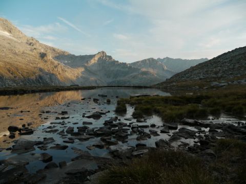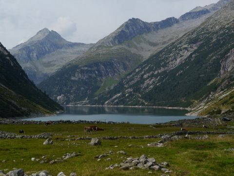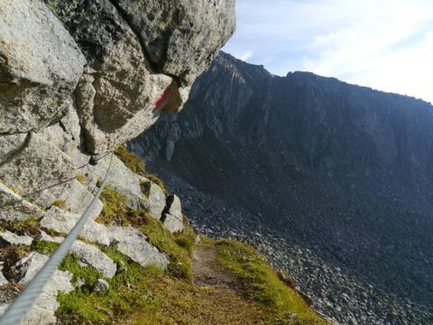 Auch die Scharte selbst ist unschwierig. Nach ihr folgen wir hinunter bis zu dem Weg zum Heilig-Geist-Jöchl, in den wir links einbiegen. Nach wenigen Metern verlassen wir diesen Weg wieder bei einer weiteren Abzweigung nach rechts. Nun geht es weiter hinunter bis in den hinteren Bereich des Zillergrund-Talschlusses. Dort folgen wir nach rechts dem Bergweg, der uns über die Hohenaualm zurück zum Aufstiegsweg der Plauener Hütte und zur Staumauer führt. Zur Bärenbadalm gelangen wir entweder über den Bergweg oder alternativ mit dem Bus (Haltestelle direkt bei der Staumauer).
